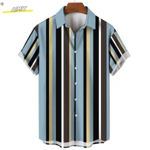 Men’s Summer Stripes Casual Shirt Hawaiian Print Short Sleeve Beachwear Vacation Fashion Social Lapel Button Oversized Clothing