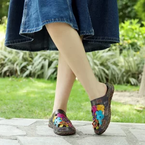 Vicconfy 2024 Summer Genuine Leather Hand Polished Vintage Colour Block Floral Comfort Women Sandals Slippers