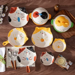 Cartoon Cute Cat Noodle Bowl Japanese Rice Bowl Salad Bowl Ceramic Dinner Plate for Children’s Kids Baking Tray Crockery