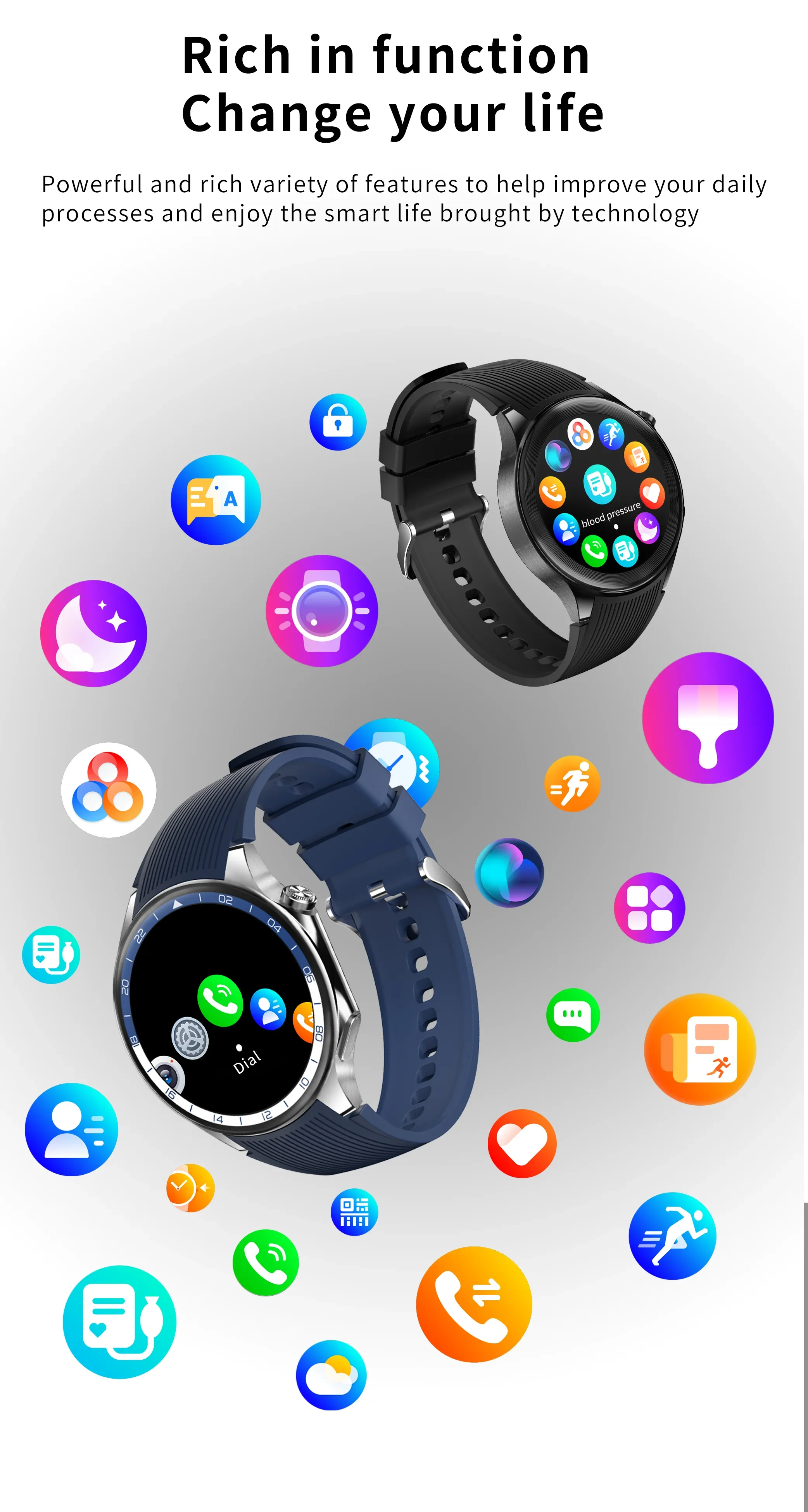 - Function: Passometer,fitness tracker,sleep tracker,Message Reminder,Call Reminder,Answer Call,Dial Call,REMOTE CONTROL,Push Message,24 hour instruction,Chronograph,Alarm Clock,Power Reserve,Month,Heart Rate Tracker,Interactive Music,Noctilucent,Calendar,Countdown
