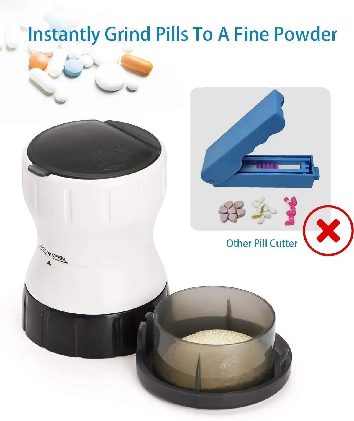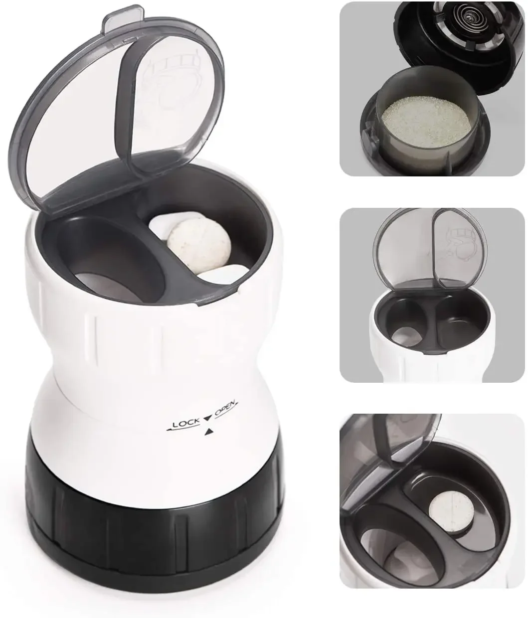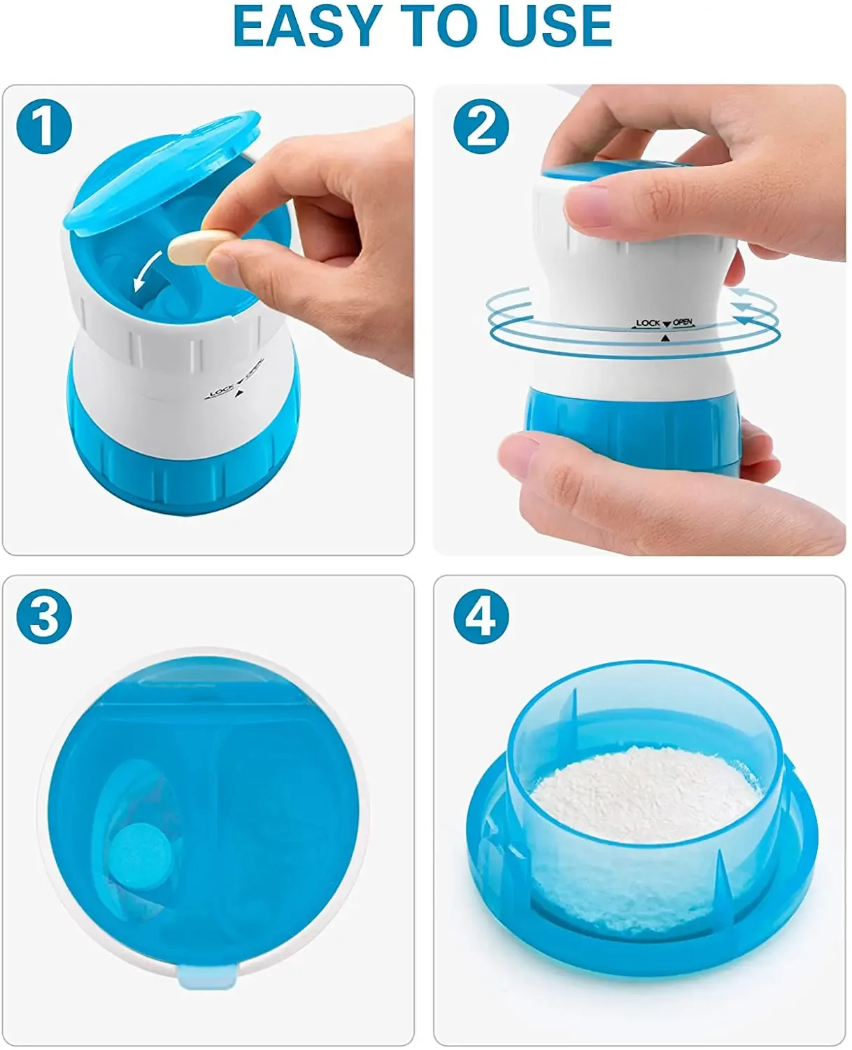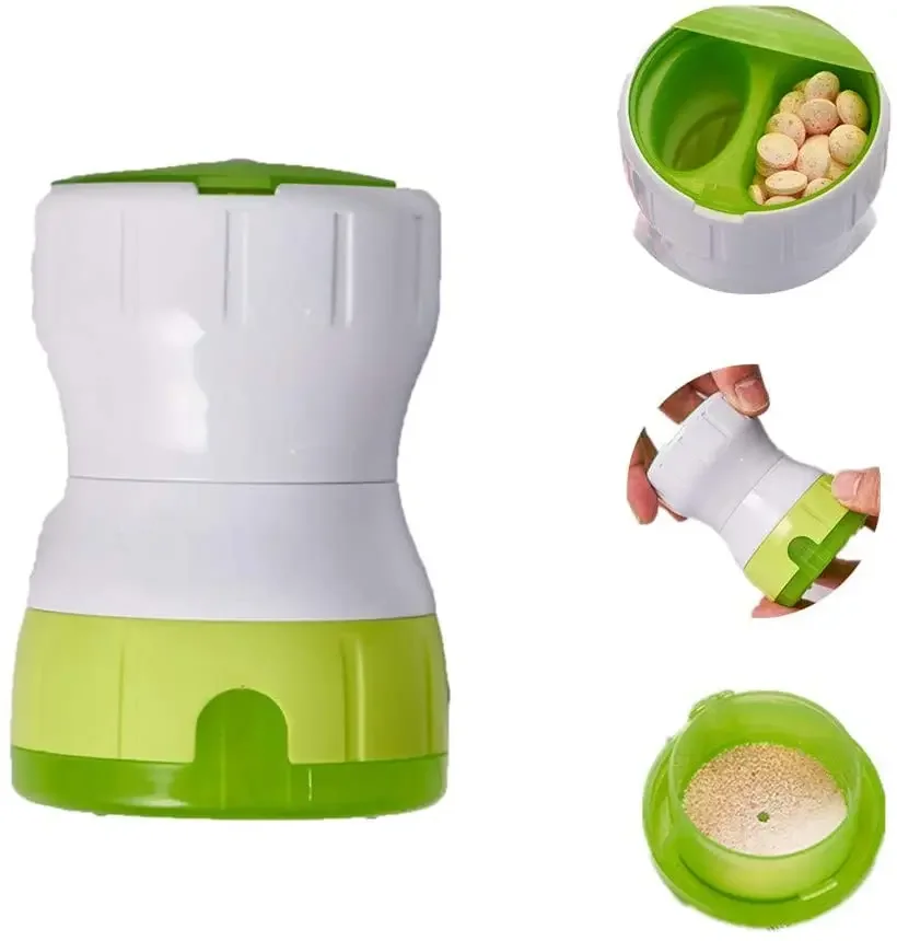 【Easy operation】 Used to grind medicines. Place the tablets in the rotating box, close the lid and face up, fix the upper or lower part, and then rotate the other part. The powder will falls into the bottom box in the process of grinding tablets.
