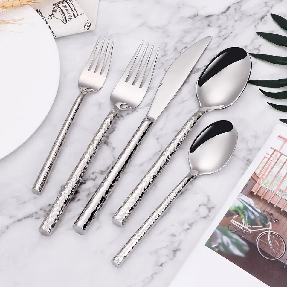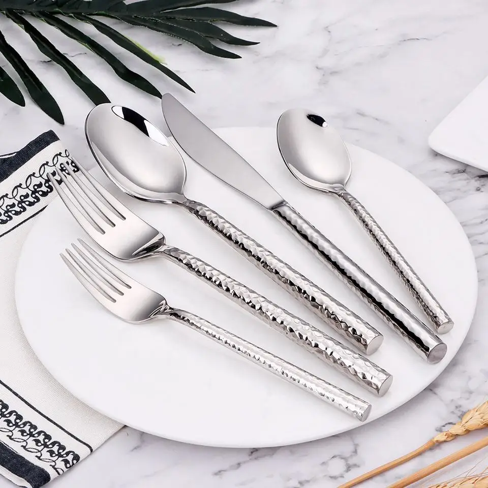 5/10/15/20Pcs Gold Tableware Stainless Steel 304 Cutlery Set Silver Hammer Pattern Handle Dinner Set Mirror Fork Spoon Flatware