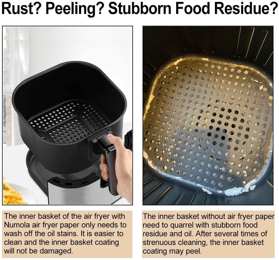 - Health Starts with Good Diet: It’s convenient to cook with Numola air fryer disposable paper liner, because you can throw it away after using it. And they are eco-friendly to environment, and safer to people without harmful gas contrast to silicone baking basket. After all, a good diet is better for your health