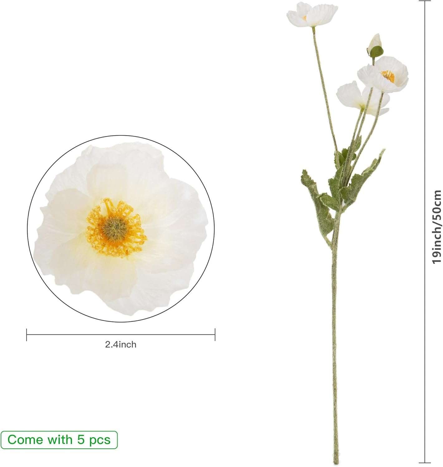 Artificial Poppy Flowers Silk Real Touch Fake Poppies for Home Decoration Wedding Centerpieces, Faux Flower Pack of 5 (White)