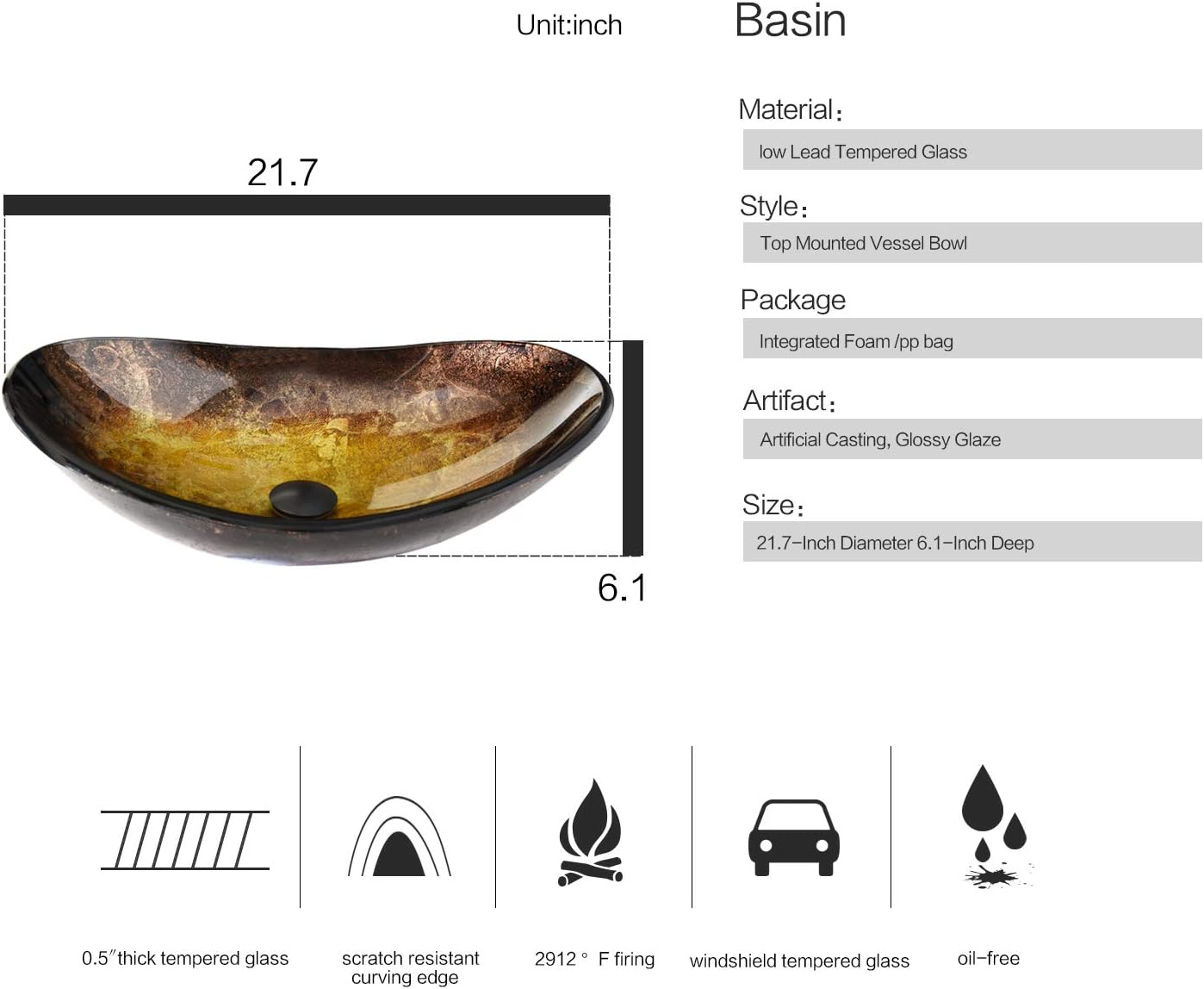 – Sink dimension: 21.7″ Length x 13.4” Width x 6.1″ Height
