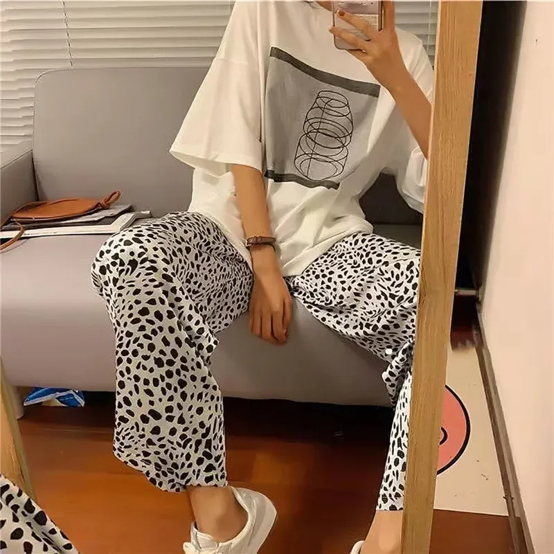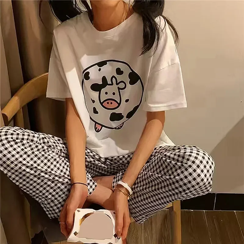 Spring Thin 2pieces Pyjamas Set Women Tops 2024 Cotton Round Neck Girls Pajamas Sets Teacup Cat Sleepwear Clothes Pijamas Mujer