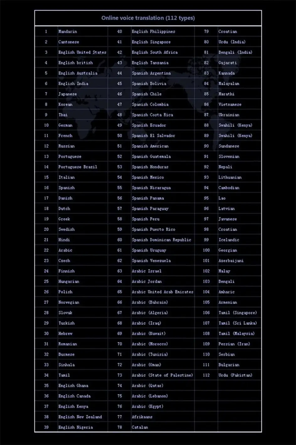 - Input Language: Spanish,Chinese,Arabic,Russian,FRENCH,KOREAN,Portuguese,japanese,Italian,English