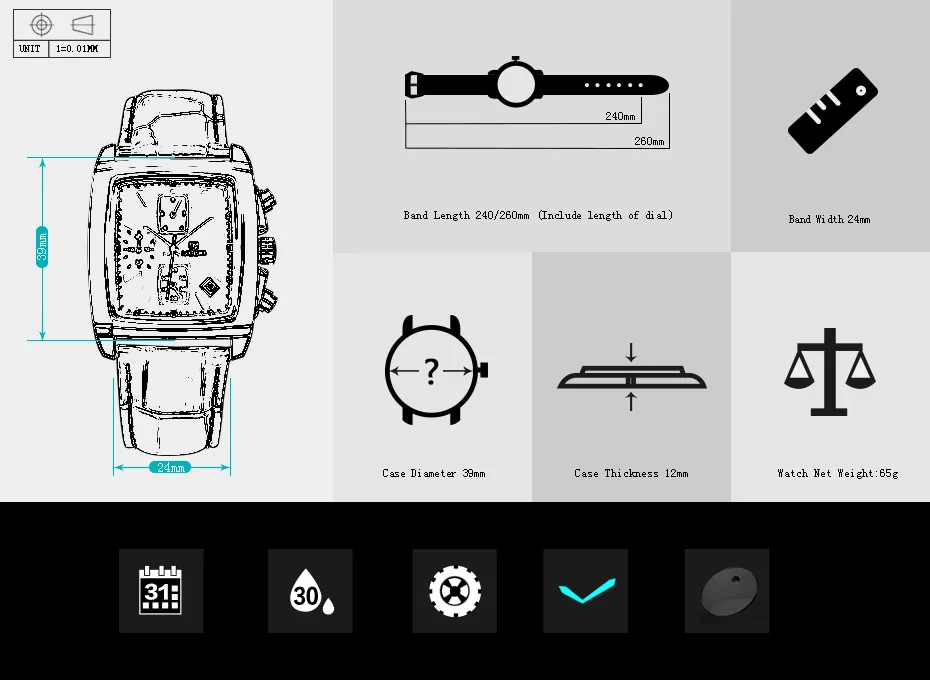 - Feature: STOP WATCH,Auto Date,Chronograph,Complete Calendar,Water Resistant,luminous hands