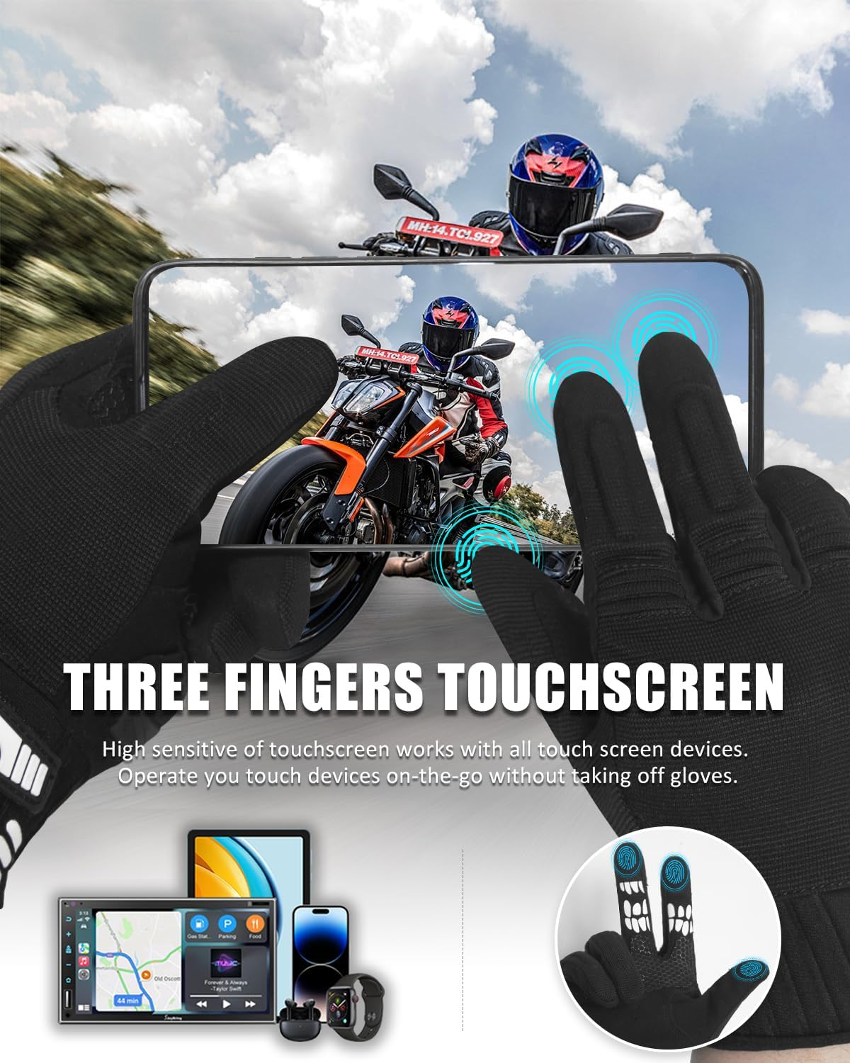 - Touchscreen Compatible: Our riding gloves with three touchscreen fingers achieve high sensitivity of touchscreen compatibility on three fingers compared to others. This function works with all touchscreen devices like GPS, cell phones, etc. Operate your touch devices on the go