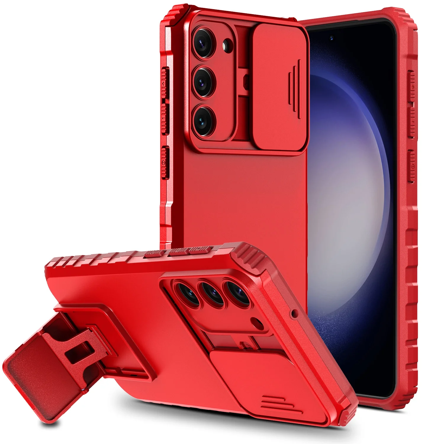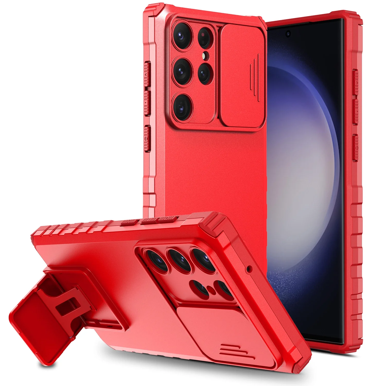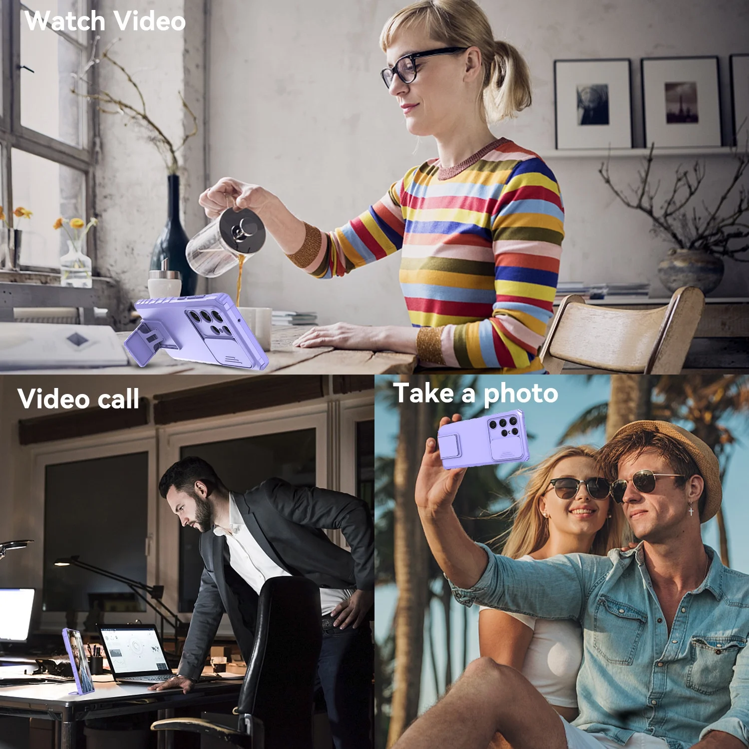 This Elegant Choise phone case with a camera lens cover is compatible with Samsung Galaxy S23 Ultra, 6.8inch. The sliding camera lens cover slides smoothly and is 0.12 inches higher than the raised lens edge to perfectly hide and protect the camera. This phone case has a built-in retractable stand, which supports vertical and horizontal multi-angle viewing. This camera cover phone case protects your new phone from scuffs, scratches, dirt, dents, and damage. Full access to all ports, buttons, and cameras on your phone without removing the case. Simple snap-on design for easy installation and removal.
