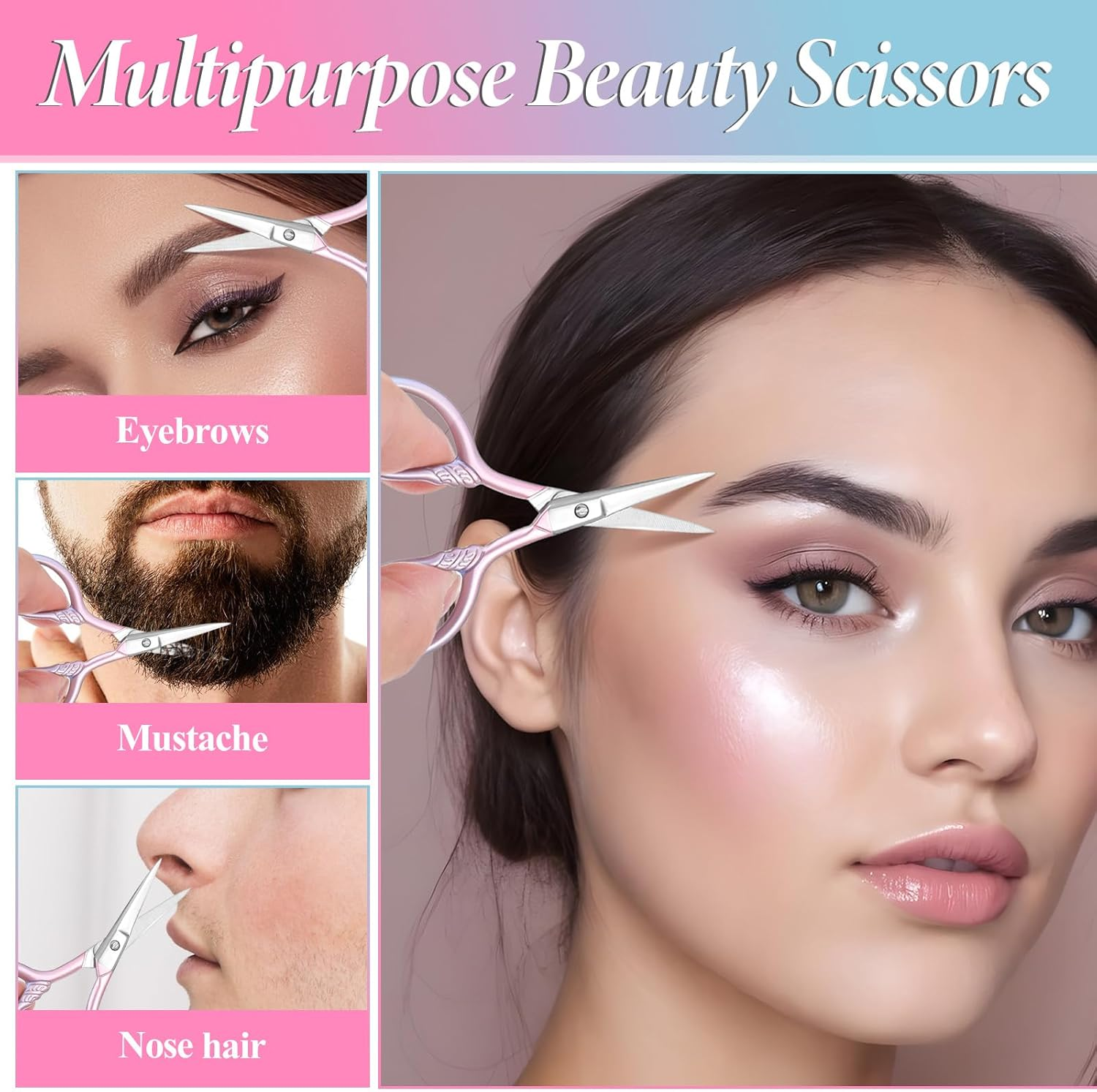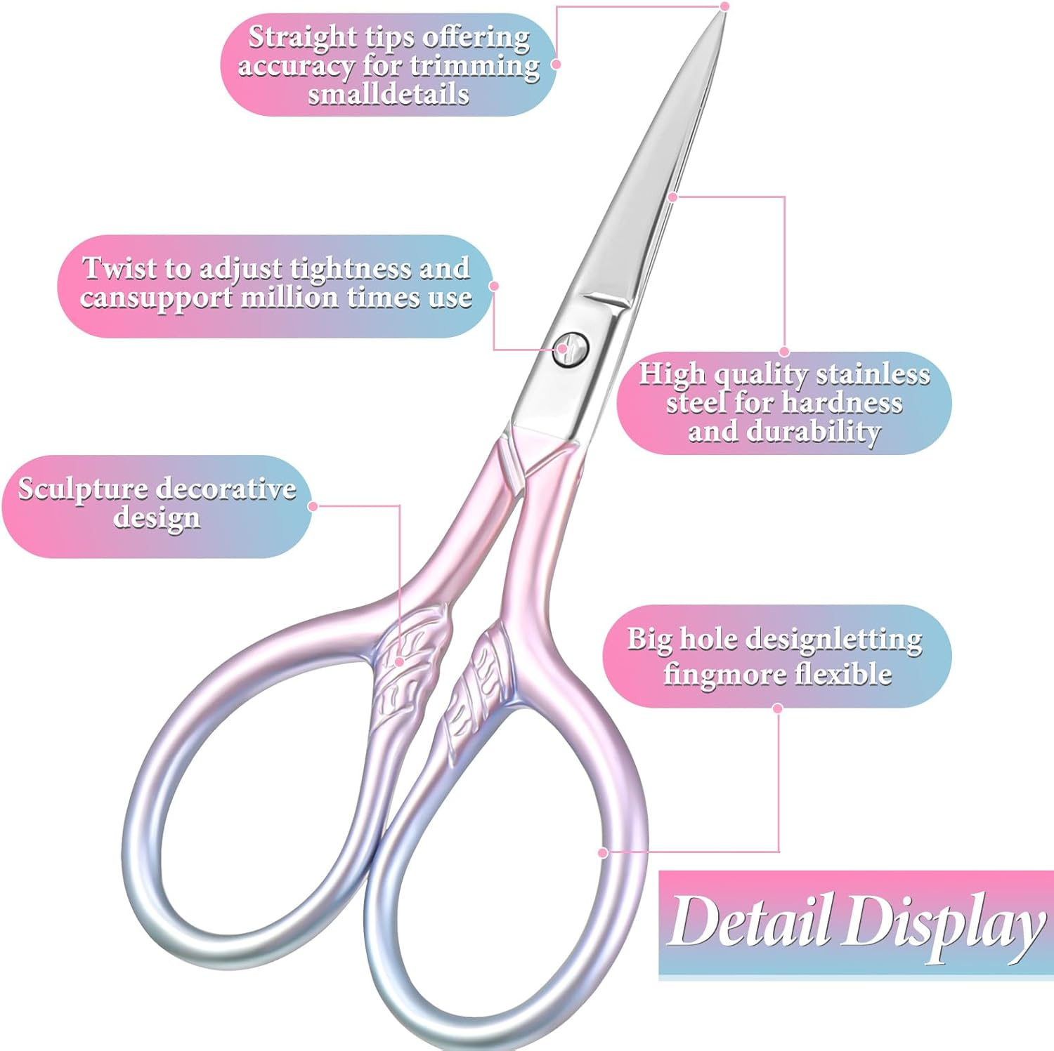 • 【Exquisite Design】: Professional brow scissors are made of high-quality stainless steel, sturdy and waterproof, ensuring long-term safe use without getting stuck, mustache scissors adopt gradient blue and pink carved handles, beautifully designed, bright and cute, ergonomic finger rings design, allowing you to hold and operate easily.