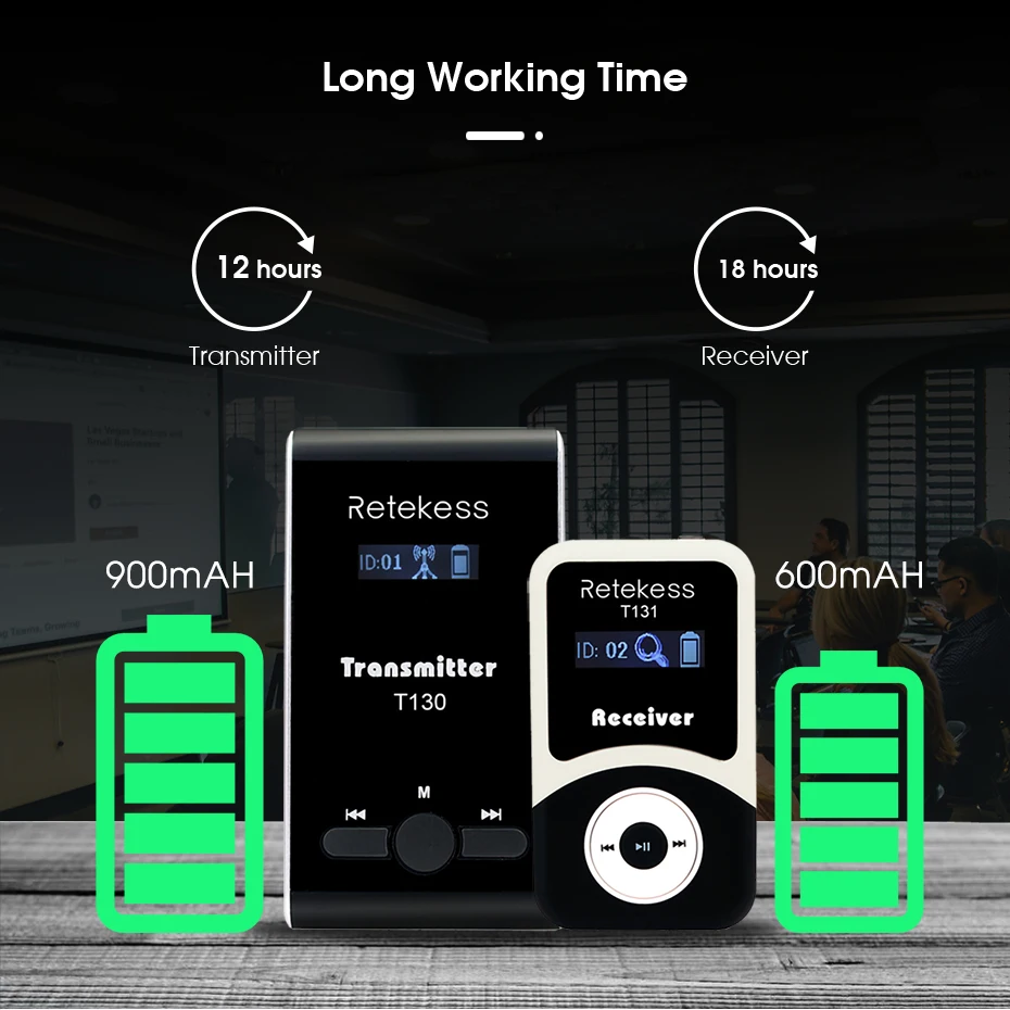 The transmitter works for up to 12 hours when fully charged in 4 hours. The receiver works for up to 18 hours when fully charged in 4 hours. These two feature long standby time, readily for a whole-day conference or journey.