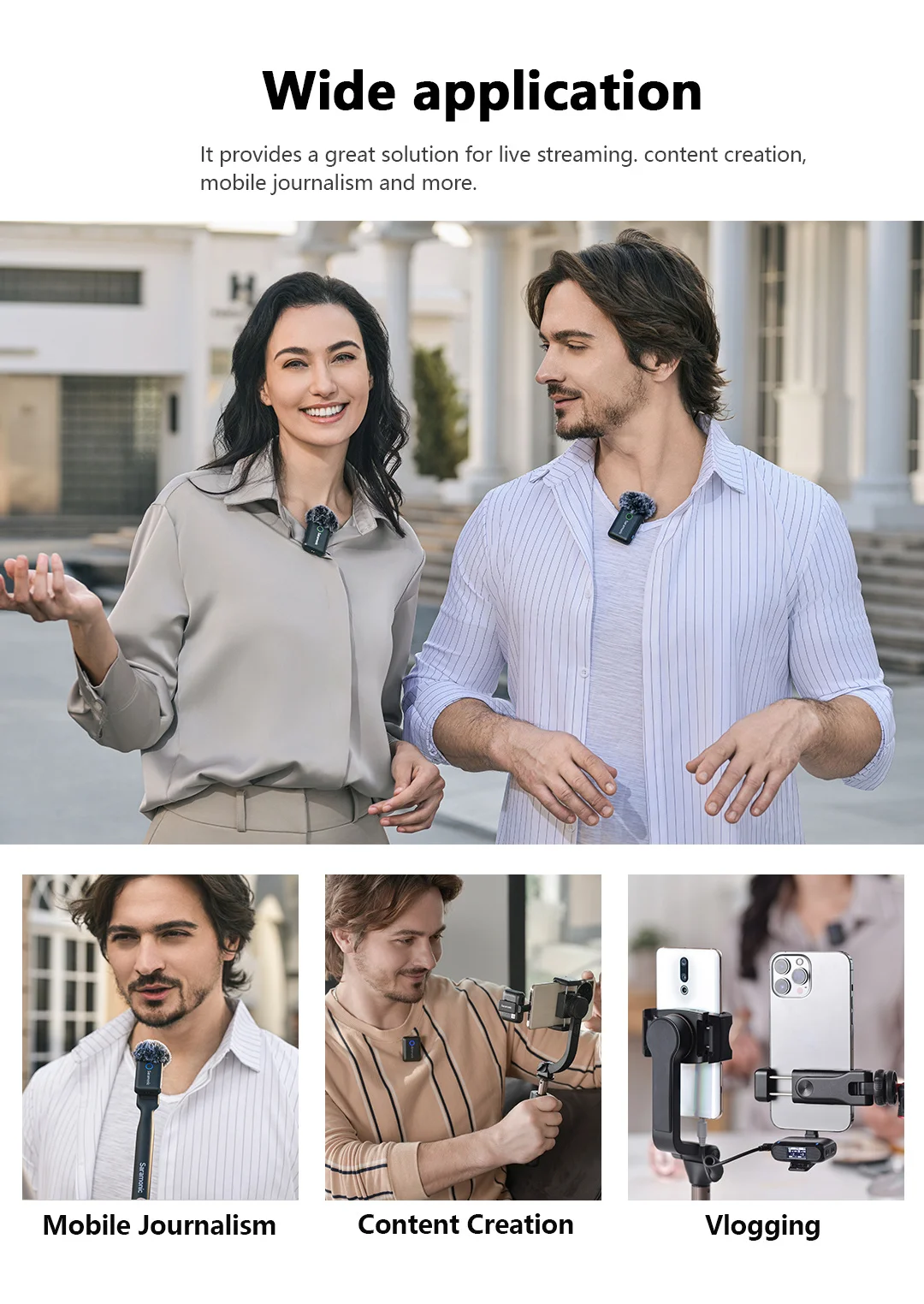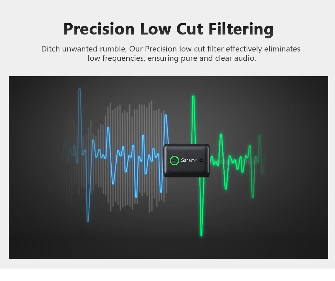 The Blink500B2+ is a portable 2.4GHz wireless microphone system. It features high-performance noise cancellation, which is available for improving the recording effect in a noisy environment. The Blink500B2+ is perfect for livestreaming, vlogging, mobile journalism, and more. What’s more, equipped with a low-cut filter, the wireless microphone can eliminate unwanted low-frequency noise( 75Hz/150Hz or lower ) in your recording.