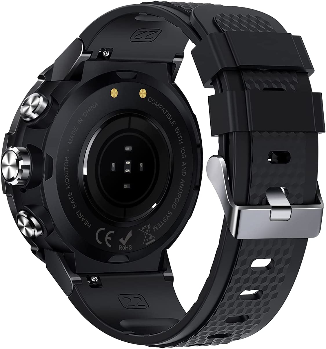 • More useful functions: Multiple watch faces pushing and Customize watch faces, Bluetooth music control and play(Superior clear audio like sound effect), Weather report push, Multilingual push, Stopwatch, Alarm clock, Timer, Remote Camera, Sedentary reminder, Female physiological period reminder, Games, Dual UI features design, etc.