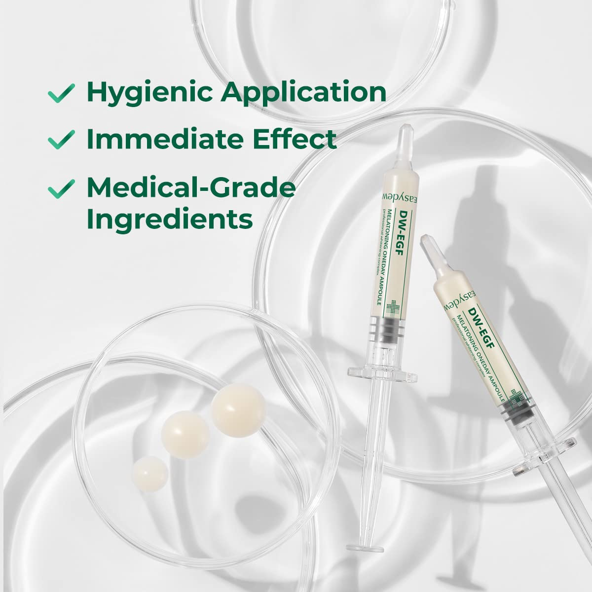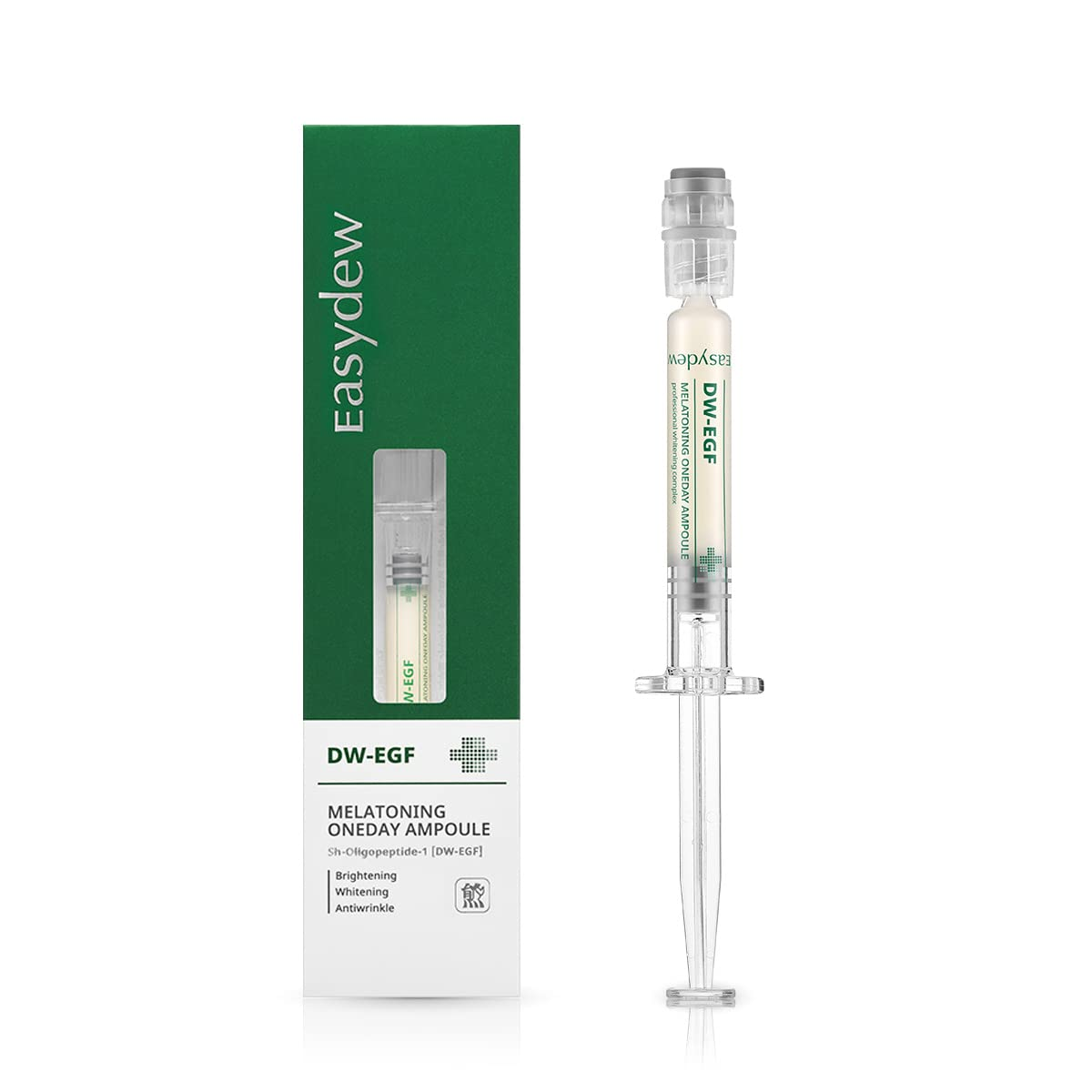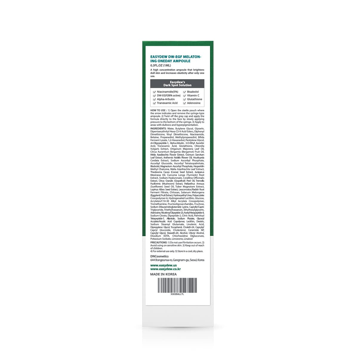 DW-EGF MELATONING ONEDAY AMPOULE 1ML is a luxurious serum designed for intensive skin care, containing a rich blend of moisturizing and regenerating ingredients that revitalize and brighten the complexion. The product is based on EGF (epidermal growth factor) technology, supporting cell renewal and restoring the skin’s healthy, radiant appearance. It has a soothing and smoothing effect, helping to improve skin elasticity and texture.