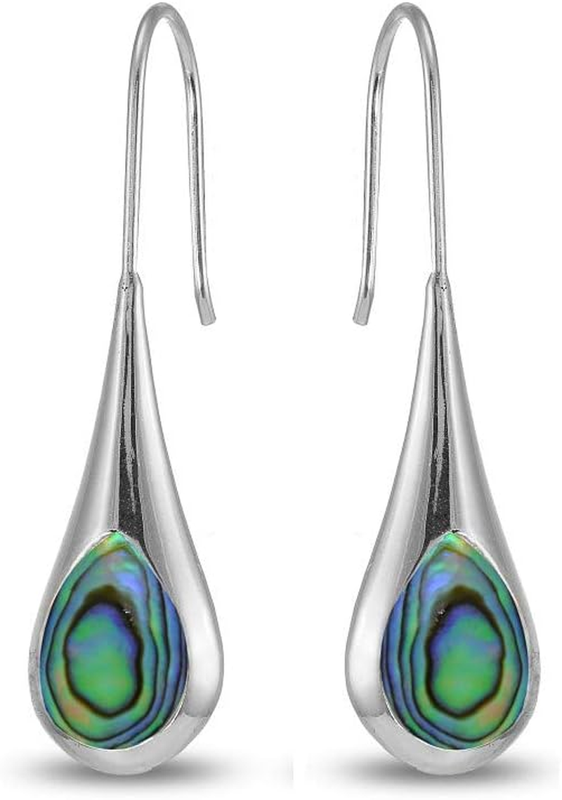 Sterling Silver Long Pear Shape Drop Earrings, Abalone, Simulated Turquoise or Mother of Pearl