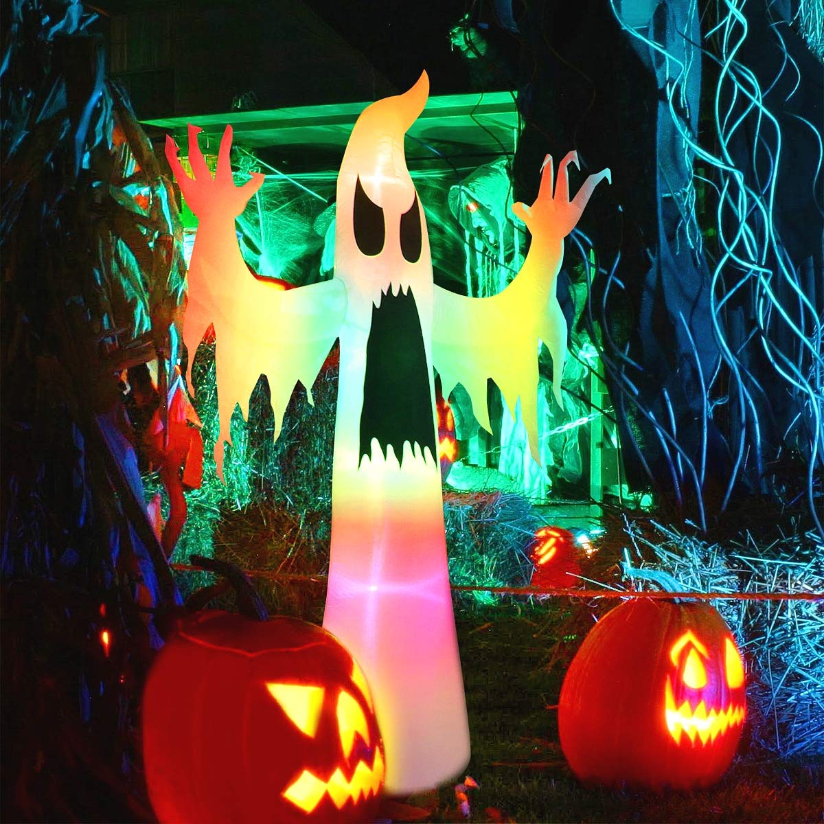 Tall ghost inflatable decoration, looks like a trick-or-treater. 8.9 ft. and the exaggerated expression can definitely scare away people around.