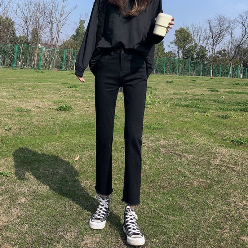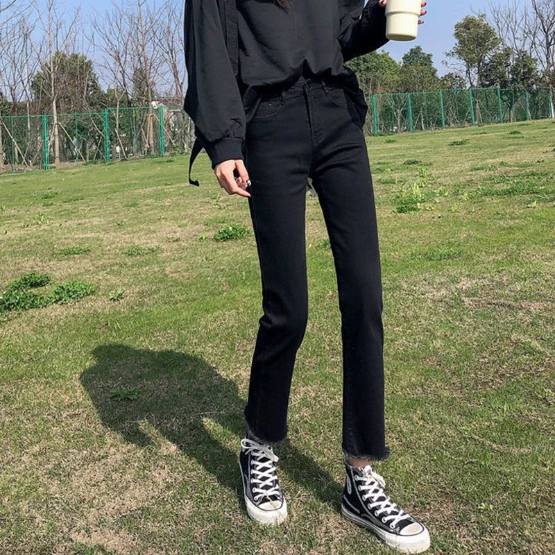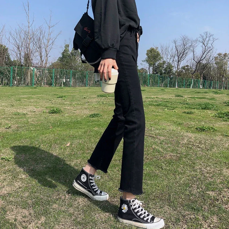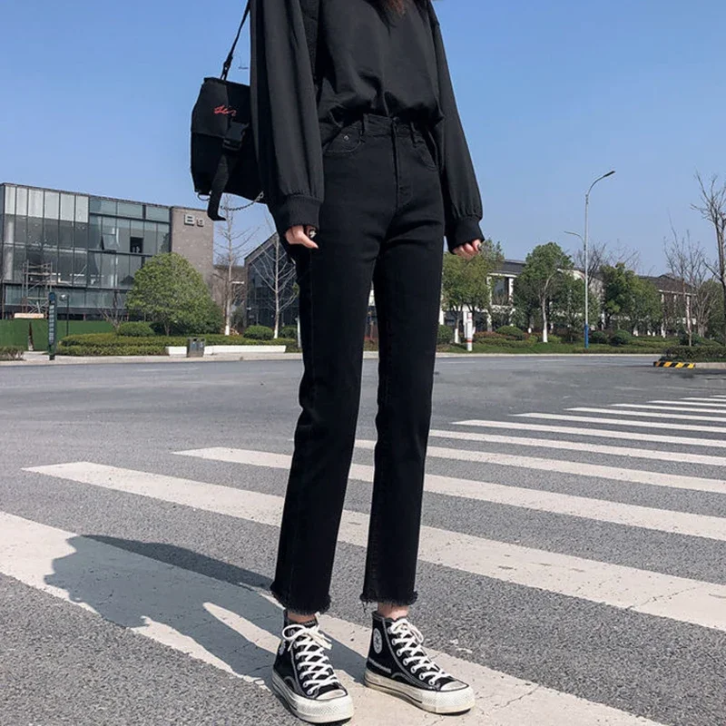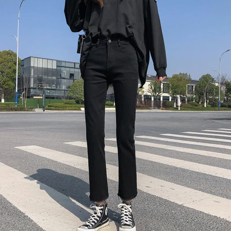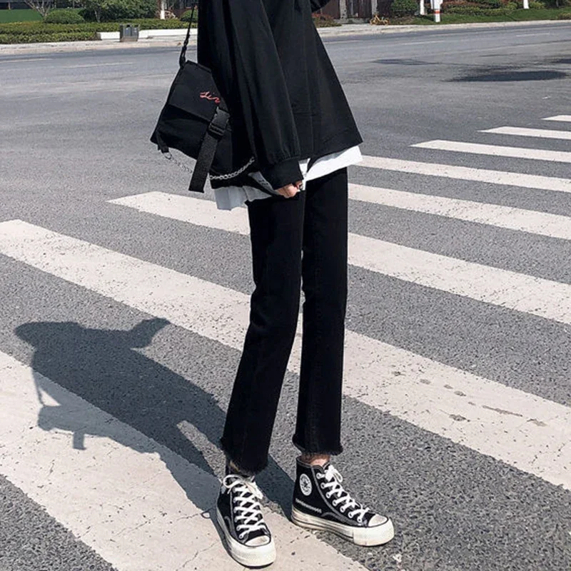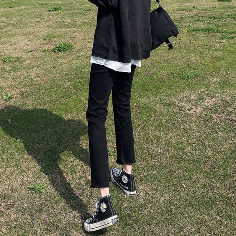 Woman High Waist Elastic Harajuku Anime Jeans Female Fashion Streetwear Cropped Pants Girls Gothic Black Grunge Denim Trousers