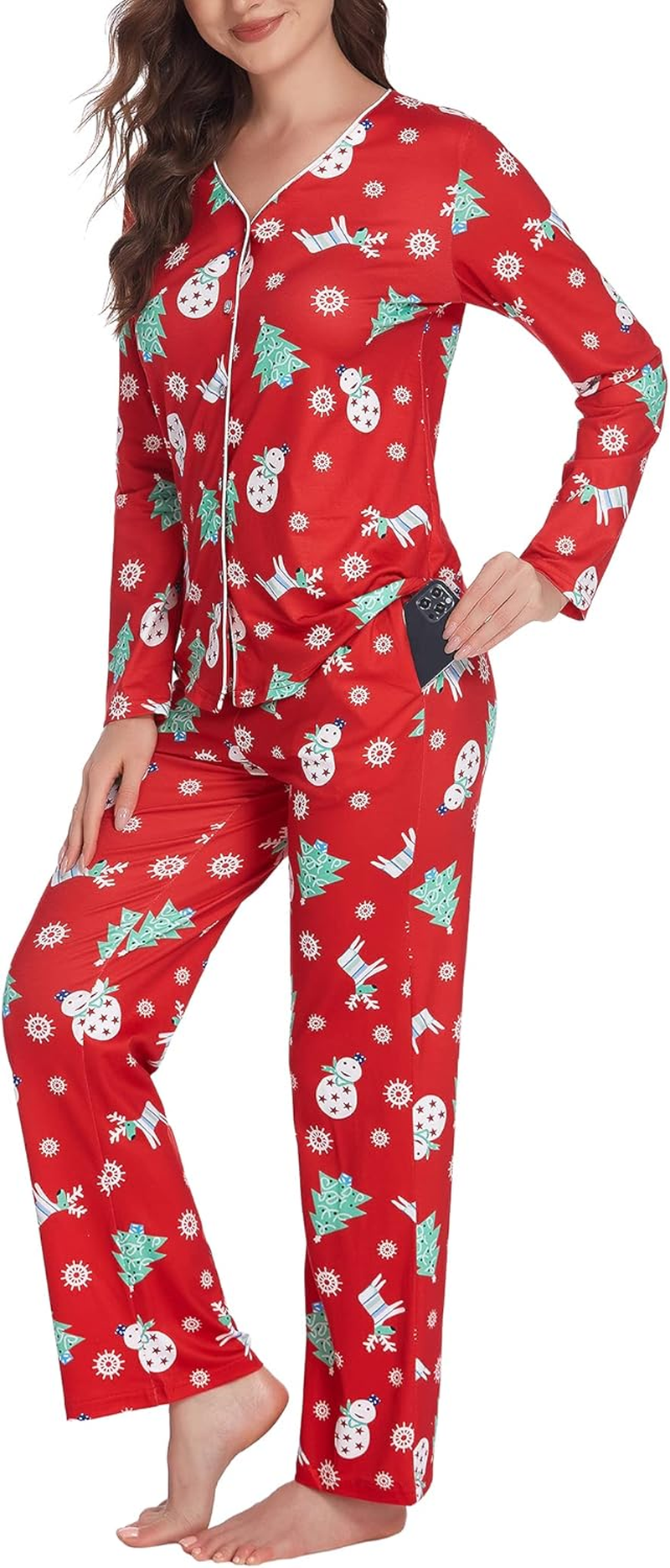 Women’S Chritsmas Pajamas Sets Button down Pjs V Neck Lounge Set Long Sleeve Sleepwear Christmas Tree Red