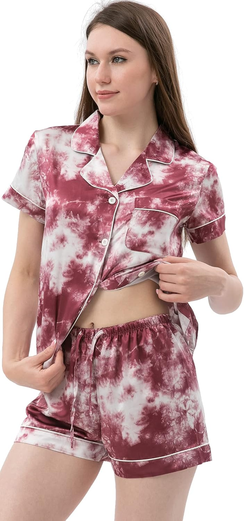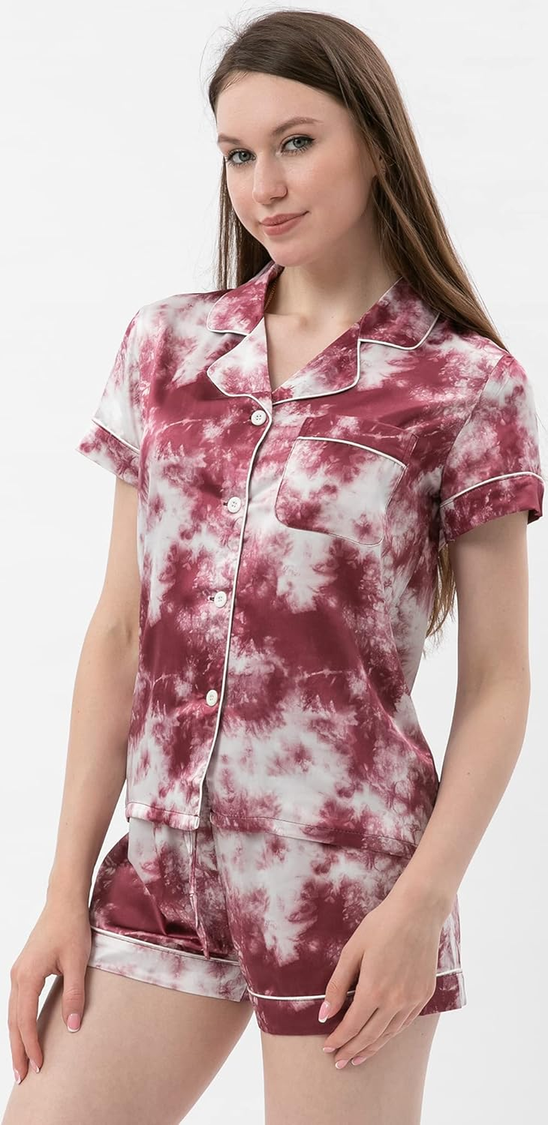 Womens Satin Tie Dye Pajamas Set Two-Piece Pj Sets Short Sleeve Silk Sleepwear Button-Down Loungewear